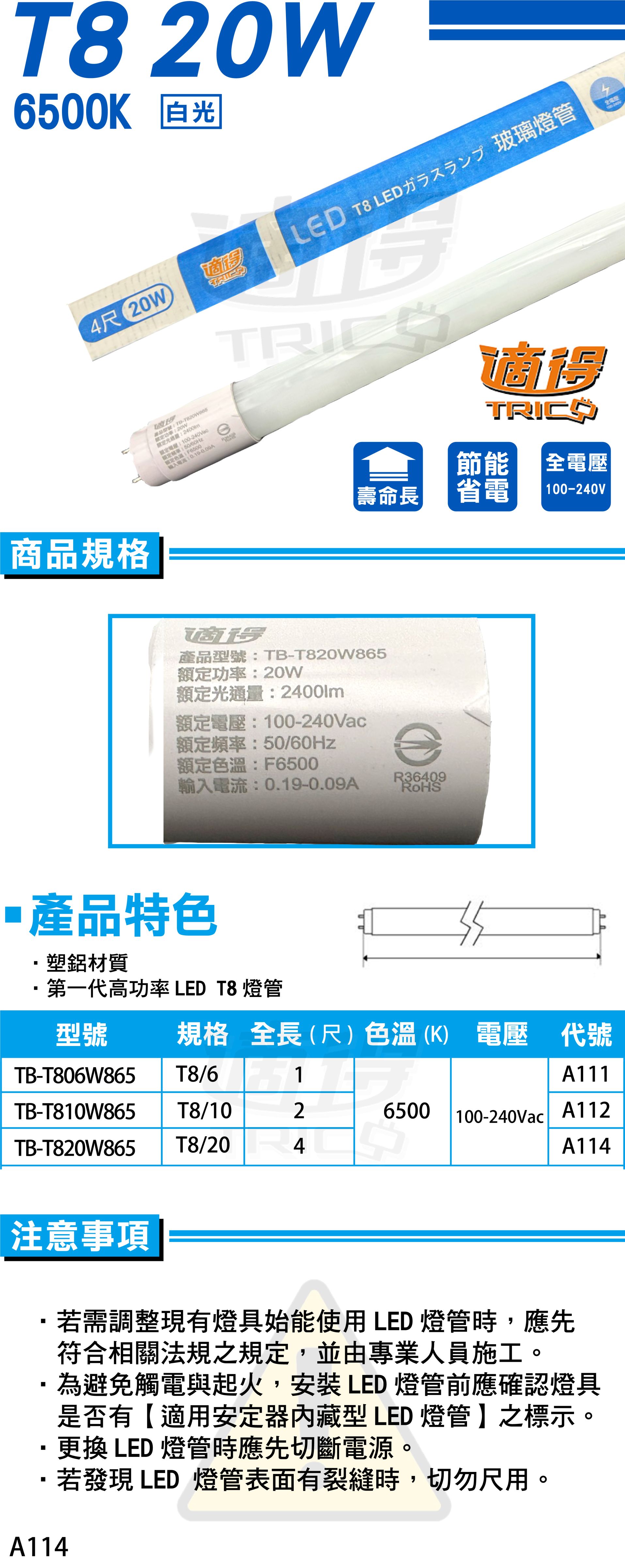【適得】T8 LED燈管 20W - 白光