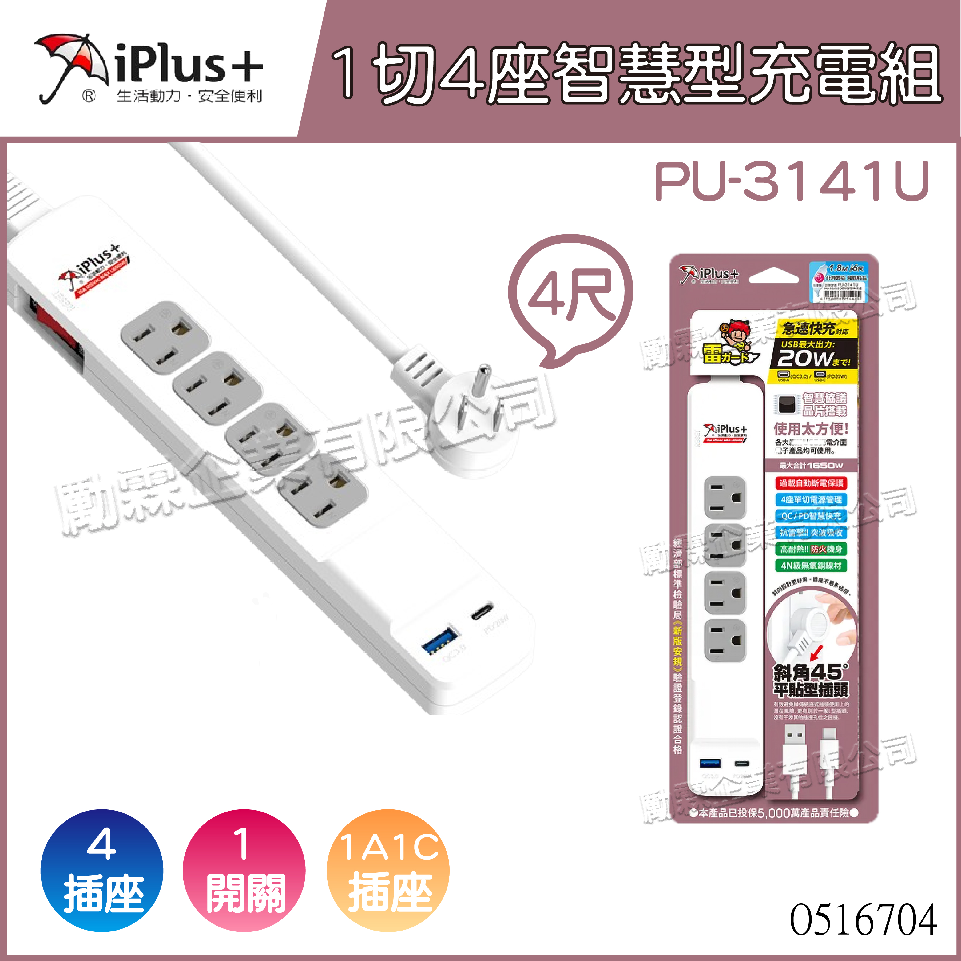 【IPLUS保護傘】1切4座智慧型充電組 - 4尺