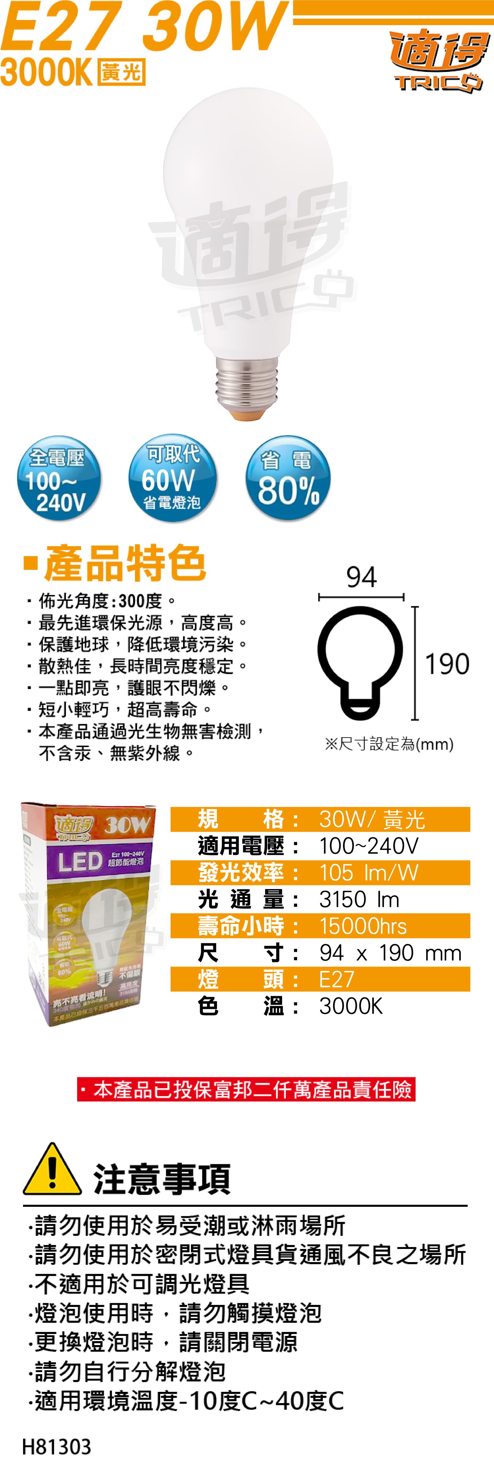 | 1. 規格:30W/黃光 2. 適用電壓:100-240V全電壓 3. 電流:0.13-0.25A 4. 發光效率:105lm/W 5. 光通量:3150lm 6. 壽命小時:15000hrs 7. 尺寸:94 x 190mm 8. 燈頭:E27 9. 色溫:3000K |