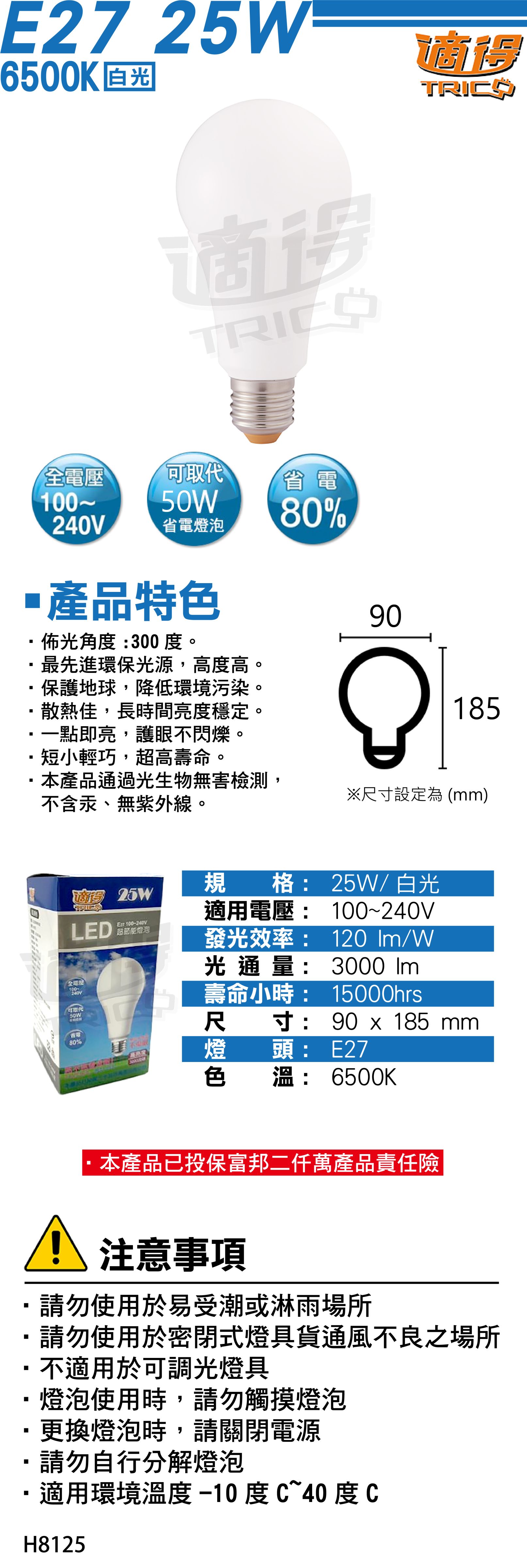 | 1. 規格:25W/白光 2. 適用電壓:100-240V全電壓 3. 電流:0.11-0.23A 4. 發光效率:120lm/W 5. 光 通 量:3000lm 6. 壽命小時:15000hrs 7. 尺寸:90 x 185 mm 8. 燈頭:E27 9. 色溫:6500K |