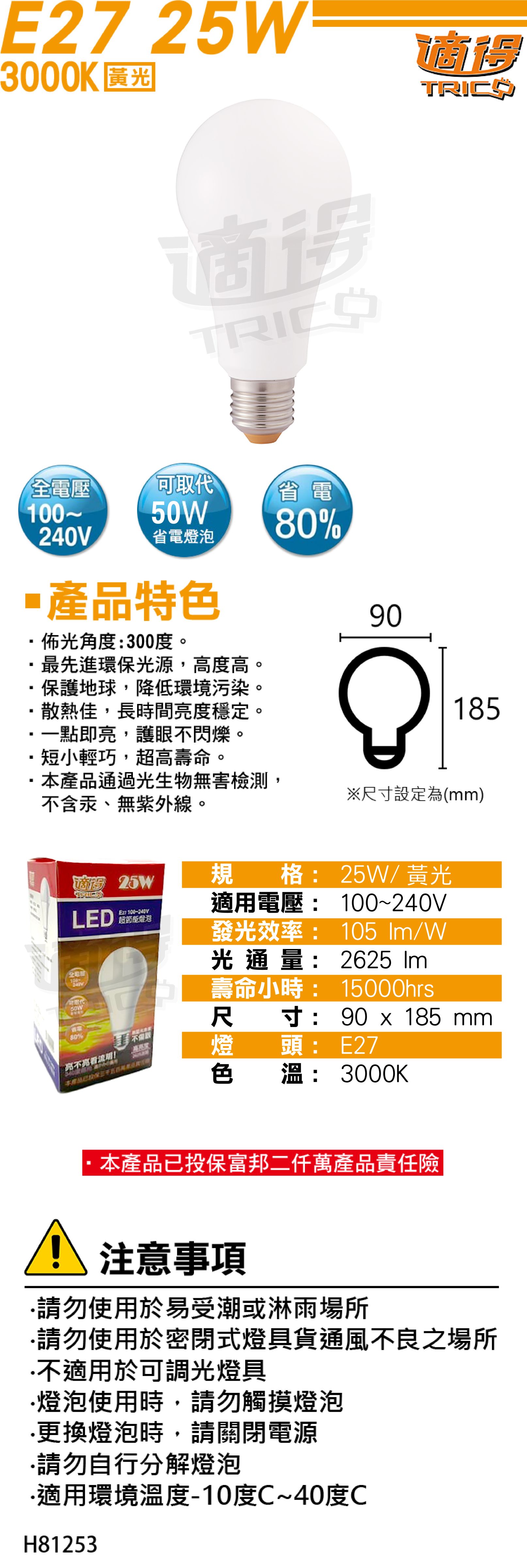 | 1. 規格:25W/黃光 2. 適用電壓:100-240V全電壓 3. 電流:0.11-0.023A 4. 發光效率:105lm/W 5. 光 通 量:2625lm 6. 壽命小時:15000hrs 7. 尺寸:90 x 185mm 8. 燈 頭:E27 9. 色溫:3000K |