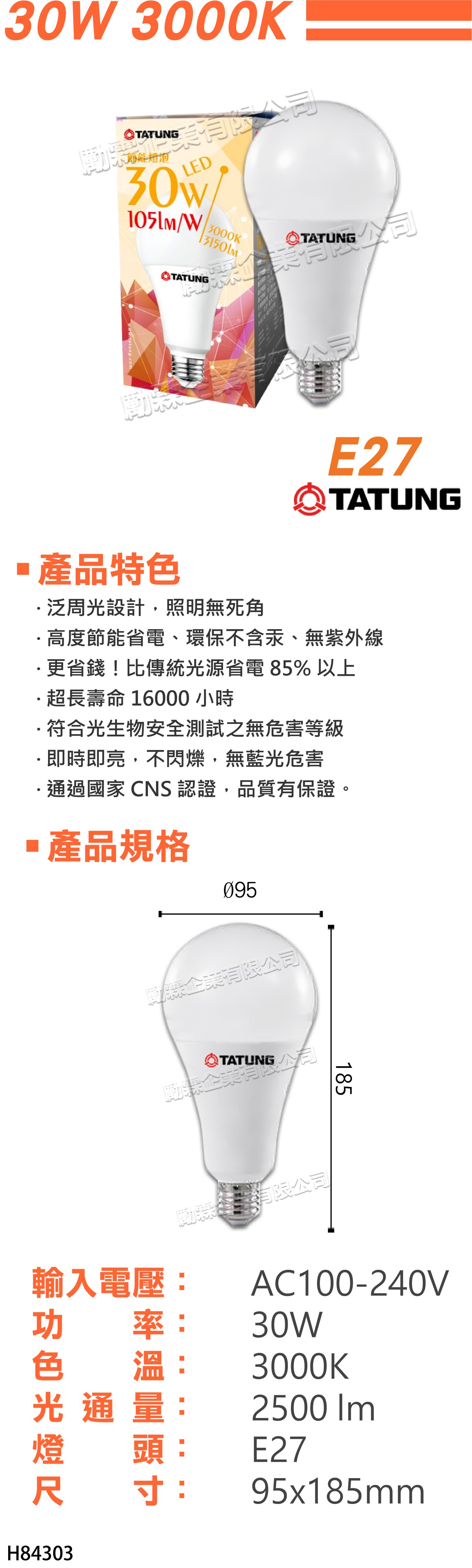 【大同】 LED 30W 超節能球型燈泡 - 黃光