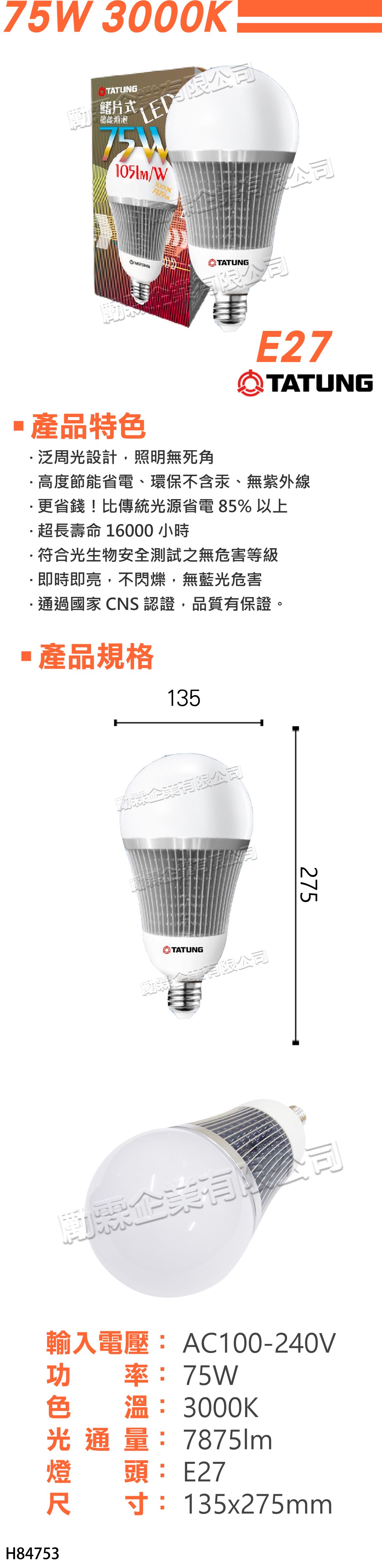 1. 規格:75W/黃光