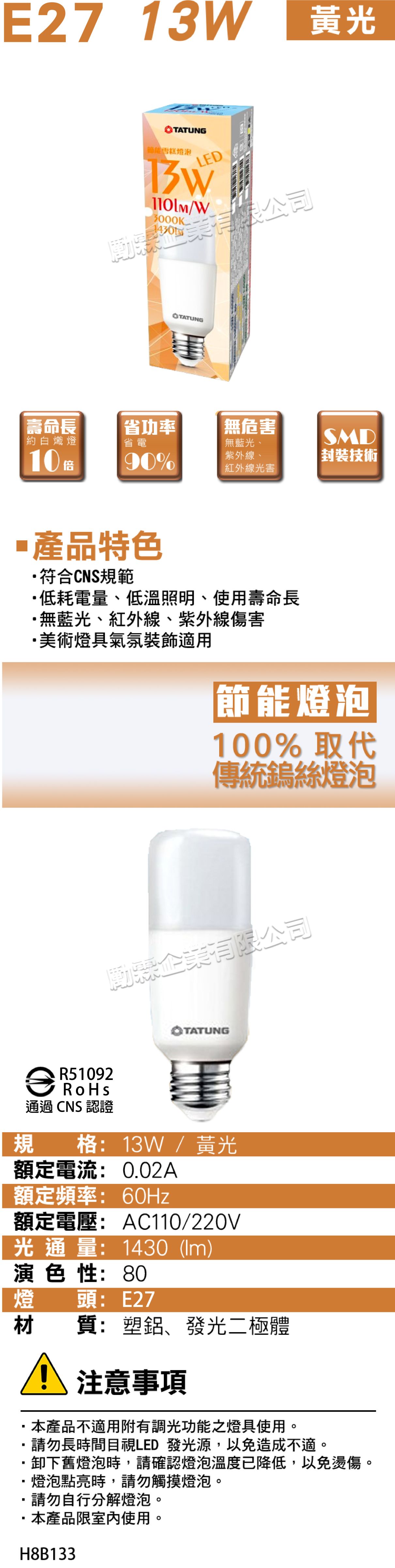 【大同】LED 13W 雪糕燈泡 E27 - 黃光