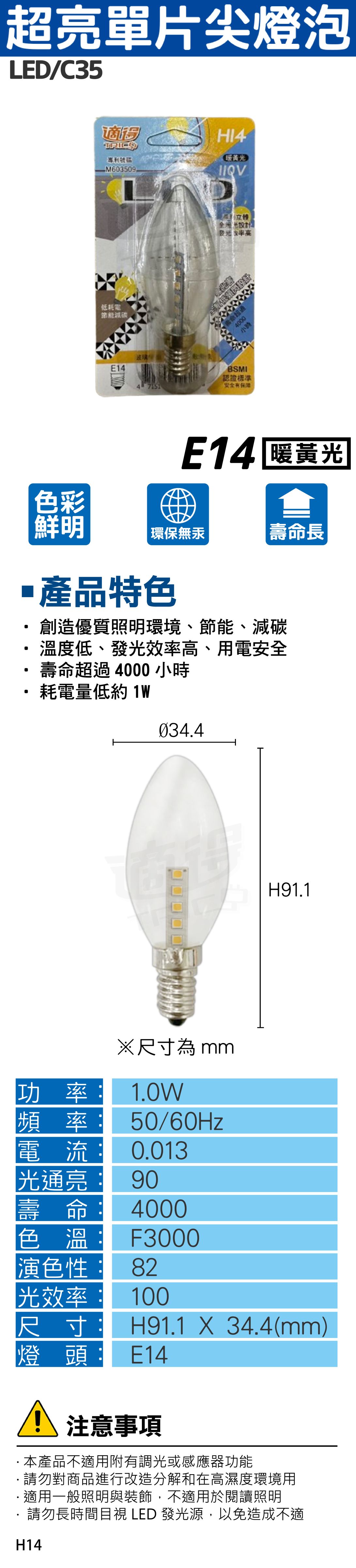 【適得】LED 小尖清燈泡 1W (暖黃光)