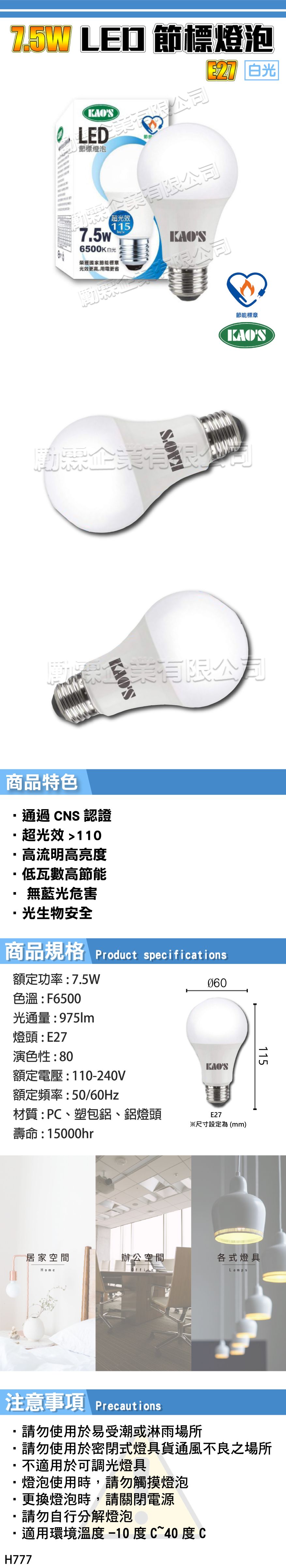 【KAOS】LED 7.5W 節標燈泡 - 白光