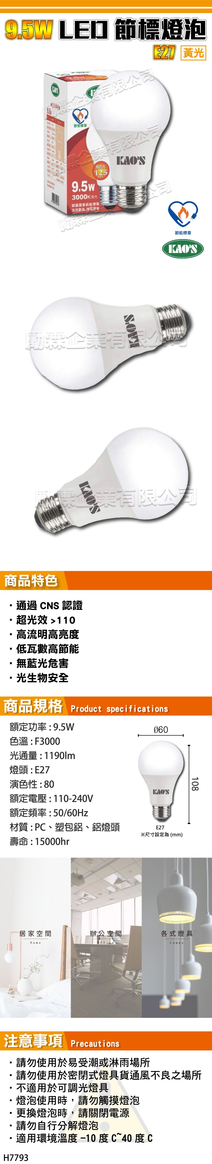 【KAOS】LED 9.5W 節標燈泡 - 黃光