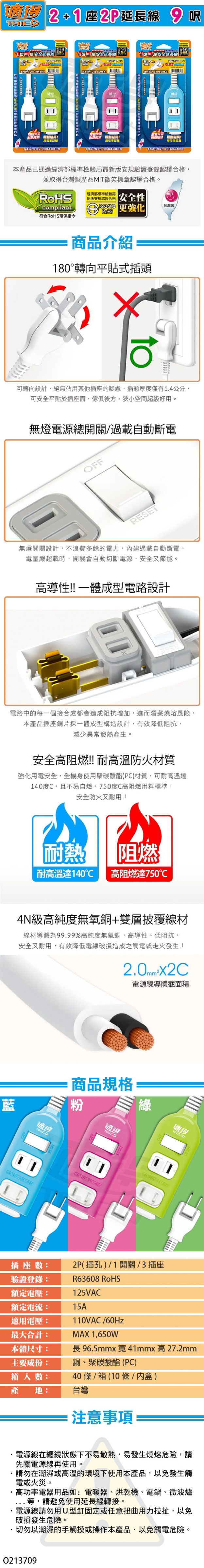 【適得】2+1座 2P延長線 (加防塵蓋) - 9呎