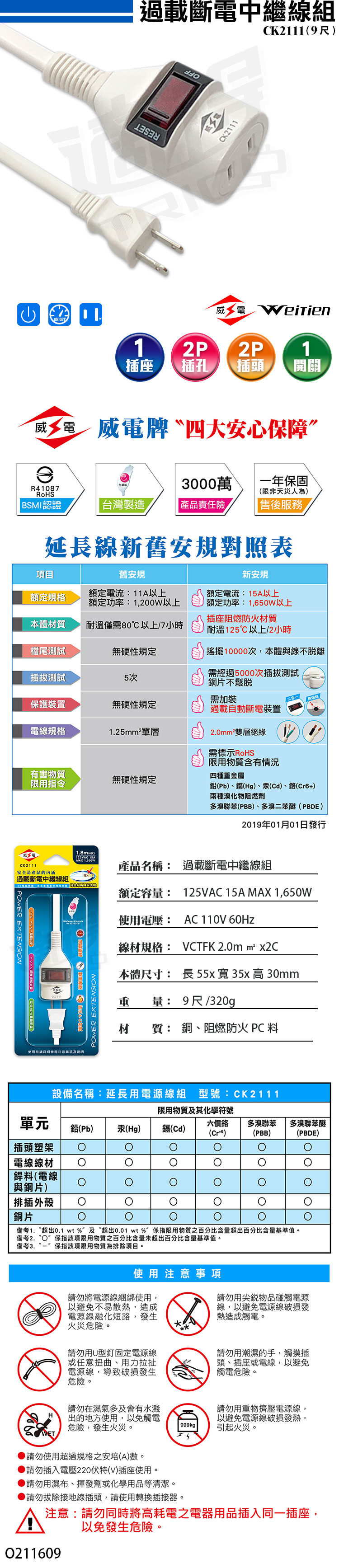 【威電牌】CK2111 過載斷電中繼線組 - 9尺