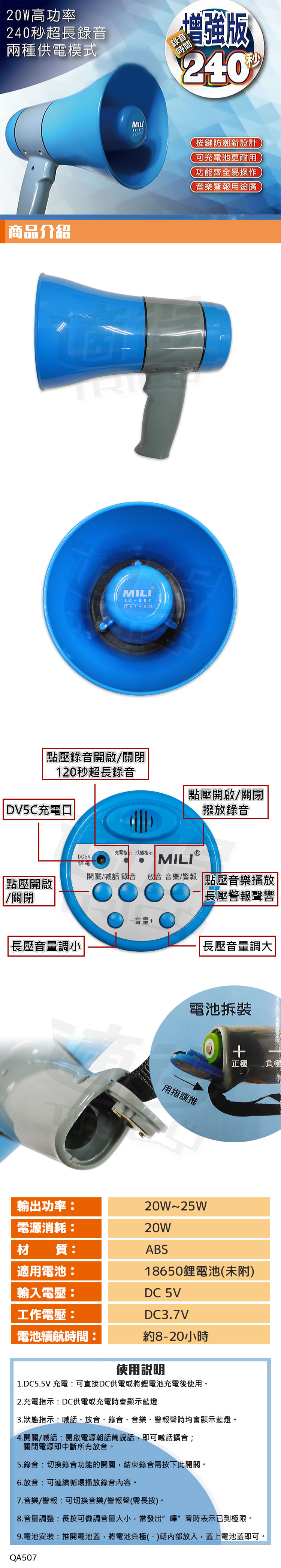 · 輸出功率:20W~25W · 電源消耗:20W · 材質: ABS · 傳送距離:順風約500米 · 適用電池:18650鋰電池(未附) · 輸入電壓:DC 5V · 工作電壓:DC3.7V · 電池續航時間:約8-20小時(依電池容量及音量而定)