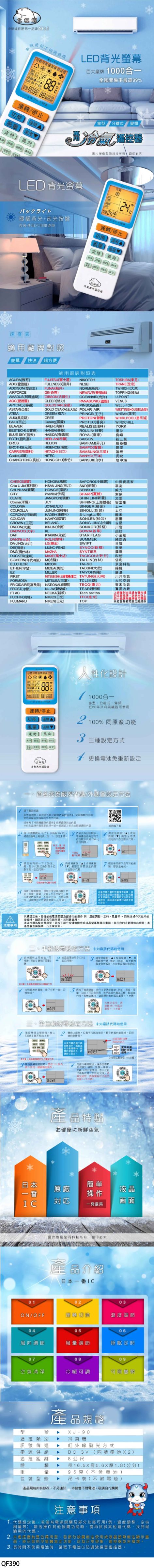 2.本遙控器為整合萬用型,若部分案件無法使用貨液晶螢幕無法顯示畫面,表示冷氣機無此功能,此為正常現象,並非遙控器損壞