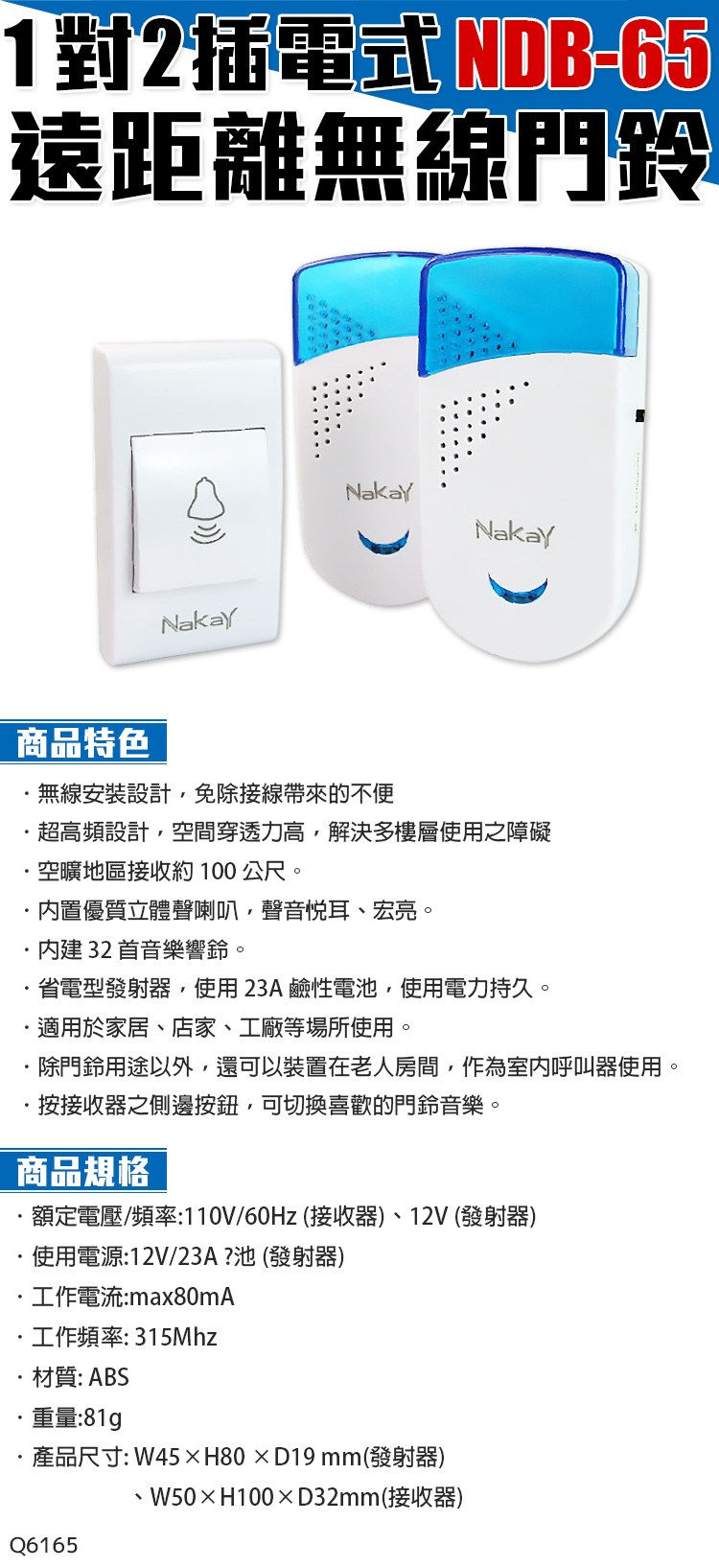 【NAKAY】NDB-65 1對2插電式遠距離無線門鈴