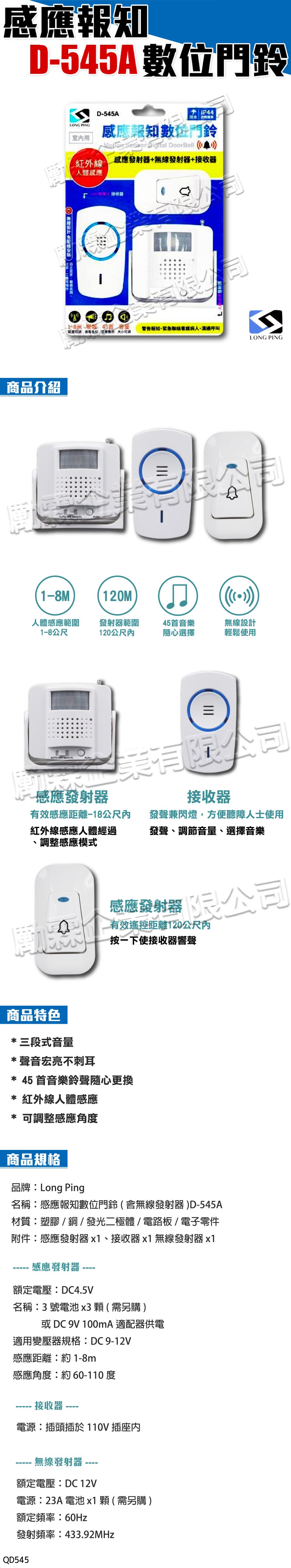 【LONG PING】 感應報知數位門鈴 D-545A